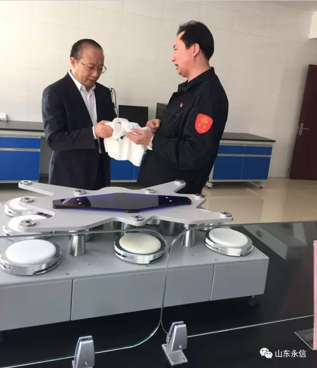 在公司新投產的水刺五線現場,夏總向袁主任介紹了該條生產線的性能特點,是全進口的高速水刺生產線,自動化程度高,生產設備工藝先進,產量大,質量穩定,可生產平紋、提花、網孔及多種纖維材料;袁主任對公司在安全生產、環境保護、循環經濟利用等方面也提出了建議和要求。在企業技術中心,夏總匯報了企業技術中心、中國醫衛用水刺非織造材料研發基地、與東華大學產學研合作運行情況,并陪同參觀了物理和生化實驗室,展示了企業產品創新和研發取得的成果,如:公司自主研發的甲殼素、山茶花、木糖醇、草珊瑚、薄荷及白竹炭等生物質纖維水刺布及后制品,簡要介紹了新產品的應用領域、市場前景、產品特性等。袁主任對公司在管理,特別是對產品創新、質量控制和5S生產現場給予肯定,希望我們繼續努力。