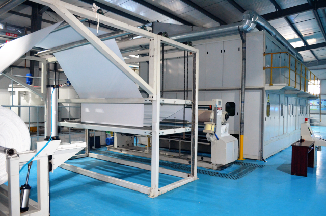 該生產(chǎn)線采用離線浸漬式上漿方式,可賦予無(wú)紡布多種功能,同時(shí)上漿均勻、布面平整光潔;由四組48只烘筒組成的烘燥機(jī)配有斜頂防塵吸濕罩,內(nèi)裝回型加熱管蒸發(fā)濕霧,防止滴水,側(cè)面配有排風(fēng)機(jī),經(jīng)外接風(fēng)管,排除濕霧。