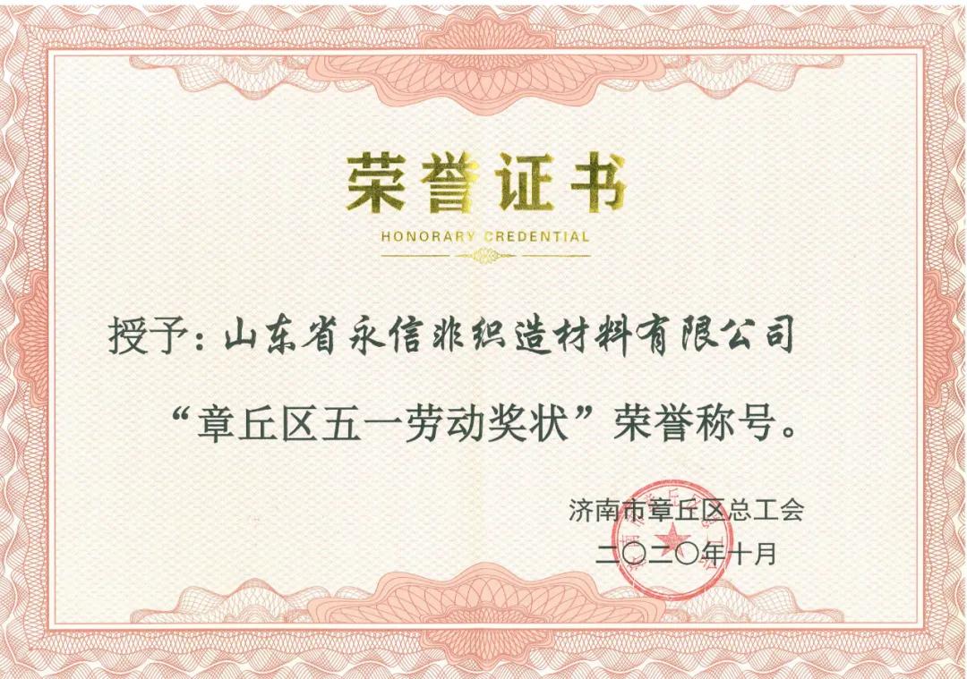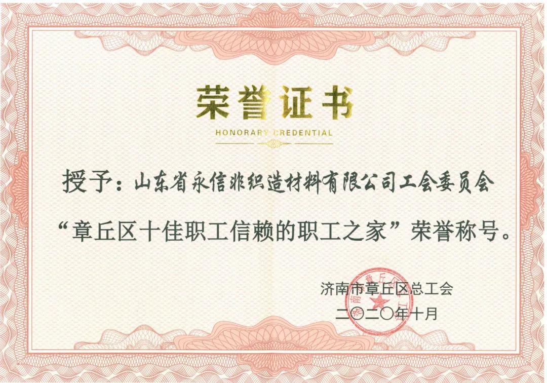近日,章丘區總工會召開了一屆二次全委會議,會議表彰了2020年度十佳職工信賴的“職工之家”和“娘家人”,山東永信工會榮獲“章丘區十佳職工信賴的職工之家”暨“新時代文明實踐站”、“章丘區五一勞動獎狀”等榮譽,這是全體職工共同努力的結果,也是對公司工會工作的肯定。