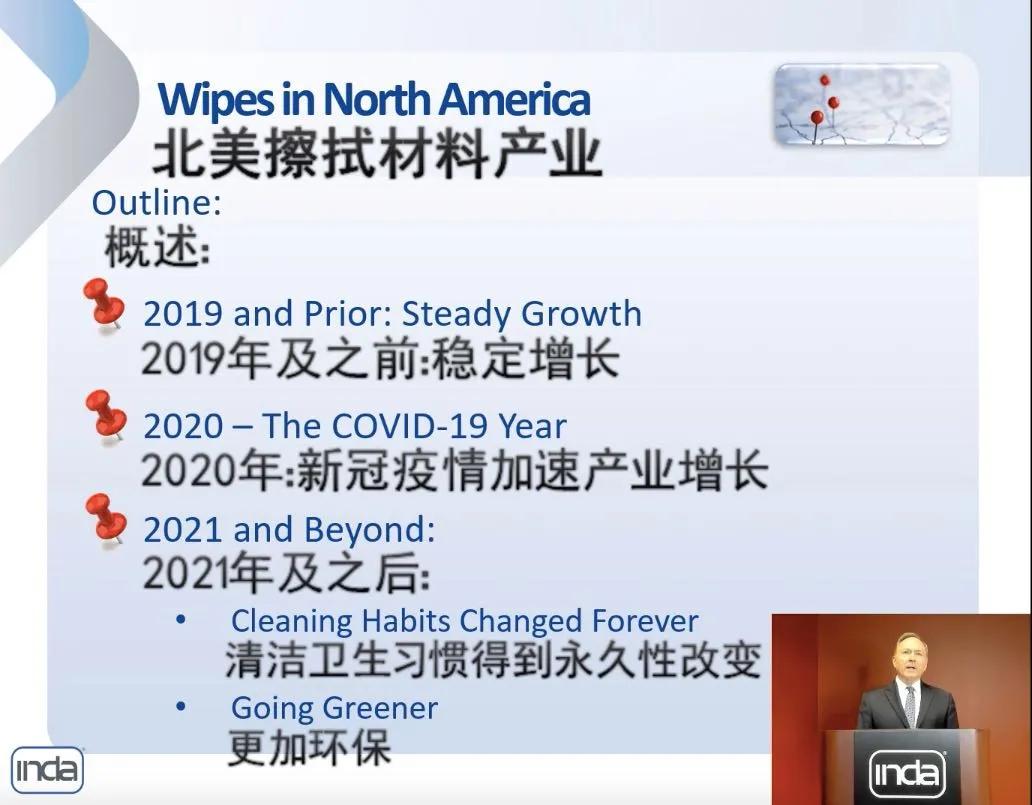 美國非織造布協會會長Dave Rousse以遠程視頻的方式介紹了北美非織造擦拭材料的發展趨勢。他認為,持續增長和更加環保將是擦拭材料未來發展的主要趨勢。北美非織造擦拭材料市場在2019年及以前保持穩定增長,新冠肺炎疫情加速了產業增長,2021年之后,清潔衛生習慣得到永久性改變,對于擦拭材料的需求還將持續提升。在談到北美一次性濕巾市場情況時,Dave Rousse說道,2020受新冠肺炎疫情影響,消毒濕巾、可沖散性濕巾消費需求大增,消毒濕巾增長率翻了一番,購買消毒濕巾的家庭數量增加了30%。濕廁紙、可沖散濕巾數量同樣激增,家庭使用率從28%增加到33%,且近80%的消費者打算繼續使用。但Dave Rousse也坦言,由于產能不足、進口增長、密集投資等因素影響,非織造產品供應鏈將面臨較大壓力,需要引起行業重視,及時提升企業和產業鏈的抗風險能力。